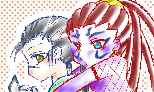 某魔人さんの髪の毛をあみあみ。とっても不服な半蔵さん。