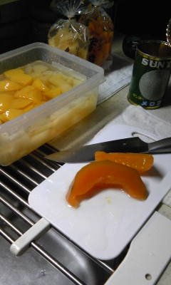 親戚からフルーツの缶詰を大量に頂いたのでタッパに開けてフルーツポンチにしました。